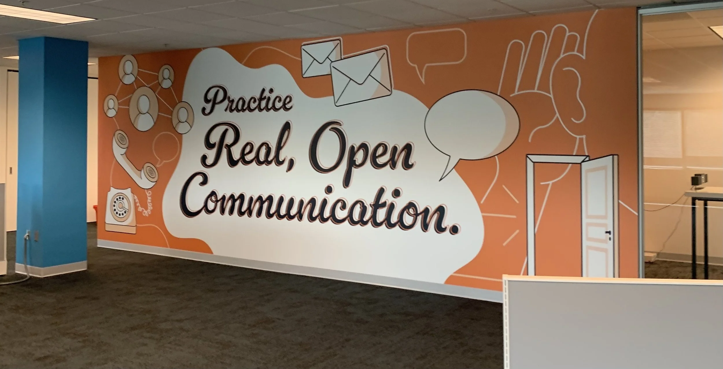 The murals transformed the office environment, creating an inspiring, branded space that reinforced company culture and energized employees. The final installation featured flawless alignment and vibrant color, earning praise from leadership and staff alike for capturing the spirit of the organization.
